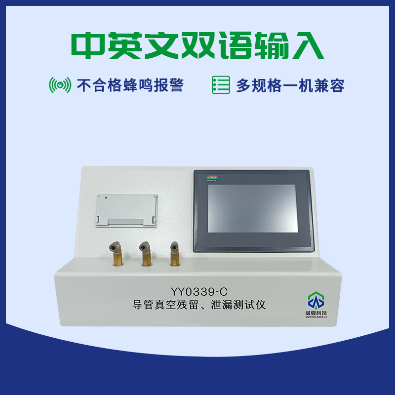 威夏科技YY0339-C導(dǎo)管真空殘留、泄漏測試儀是國家檢驗生產(chǎn)廠家產(chǎn)品性能的高效檢測設(shè)備,主要用于測定呼吸道用吸引導(dǎo)管的殘留真空和泄漏的物理特性,是鑒定呼吸道用吸引導(dǎo)管的重要手段之一。適用于輸液器、輸血器、輸液針、麻醉包過濾器、管路、導(dǎo)管、快速接頭等測試。設(shè)備由可編程控制器,觸摸屏、壓力傳感器、加壓抽壓裝置和機(jī)載打印機(jī)等組成。